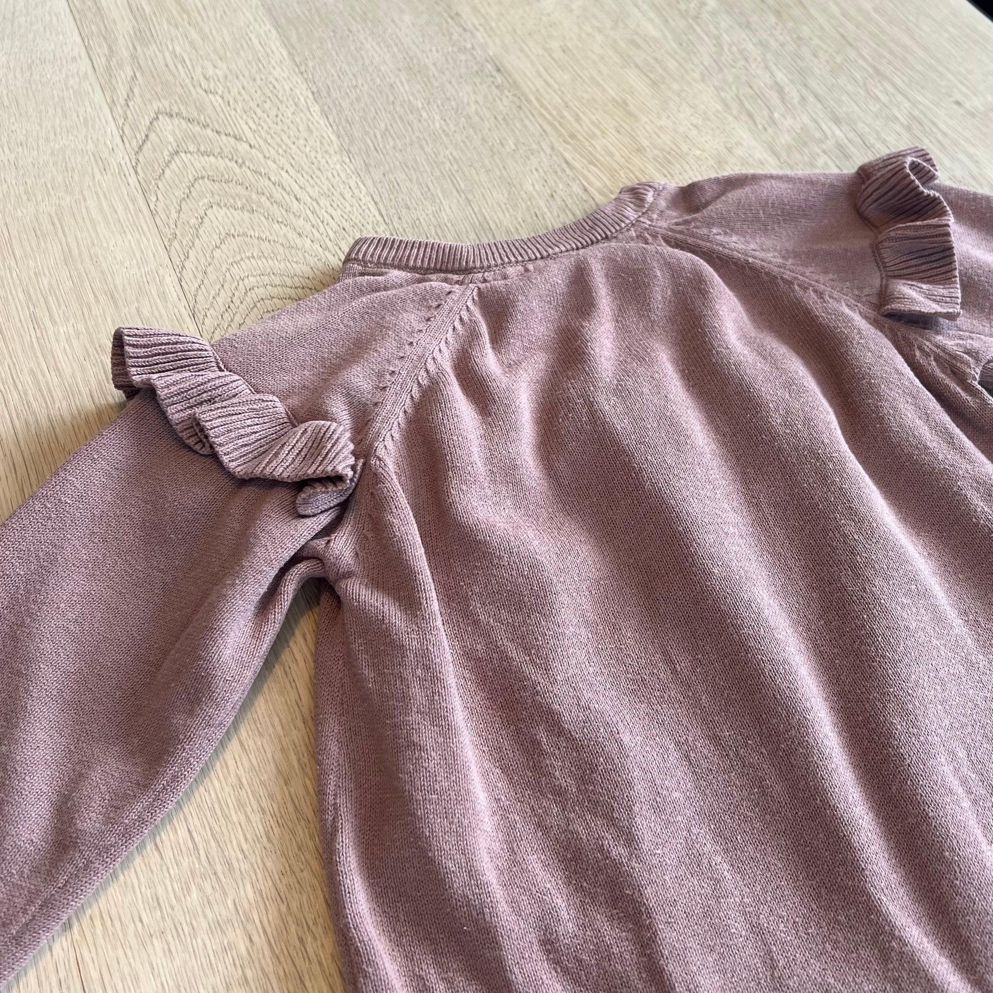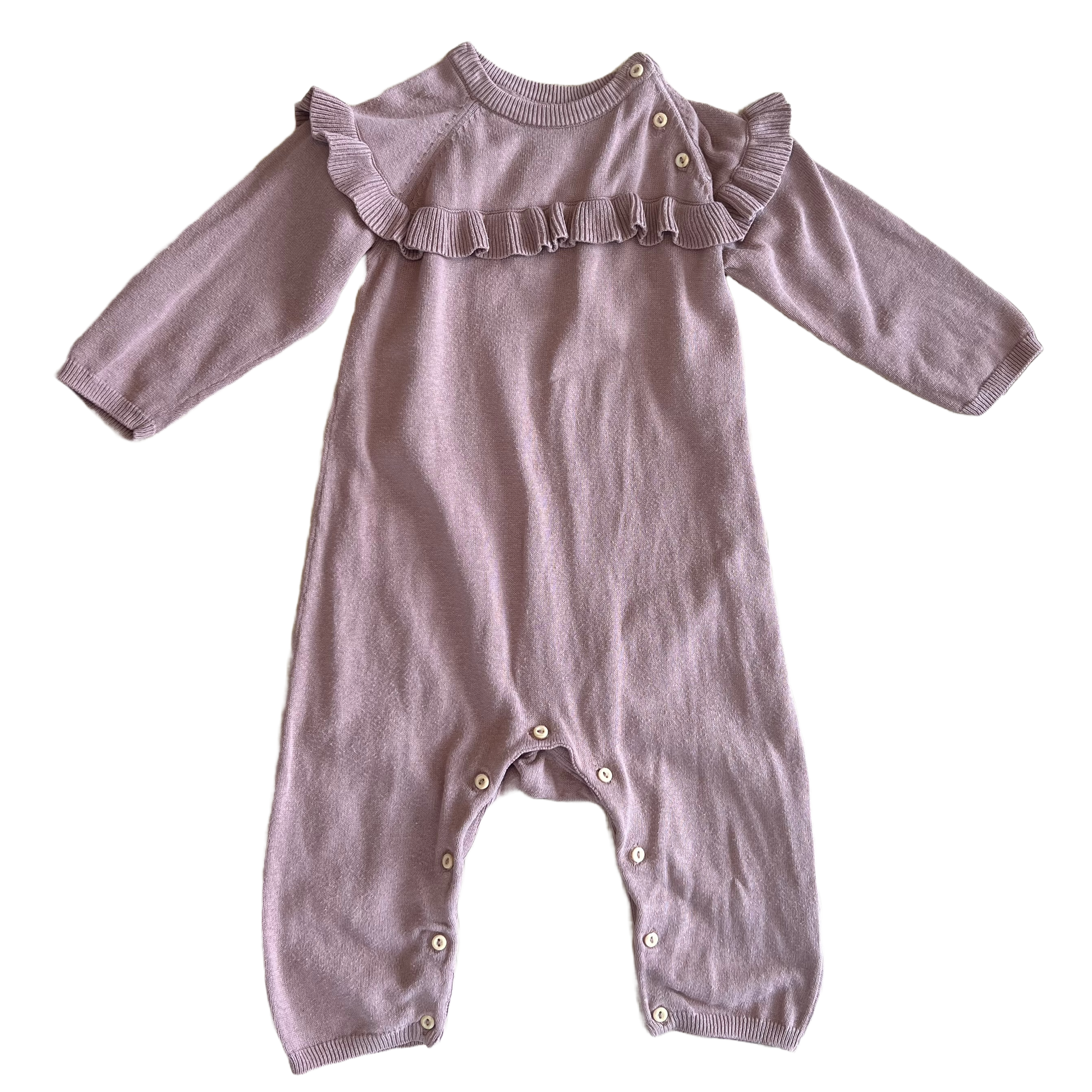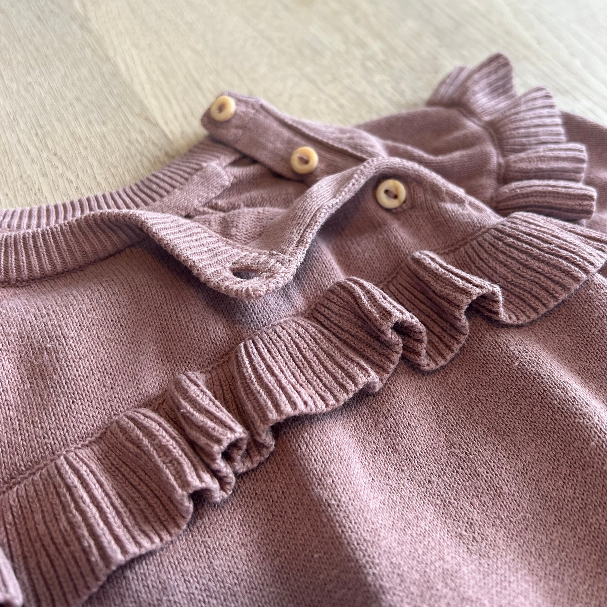 Den bløde, strikkede kvalitet sikrer, at dit barn er komfortabelt og varmt hele dagen. Heldragten har en elegant flæse detalje langs kraven og ærmerne, der tilføjer et charmerende og feminint touch til det klassiske design. De praktiske knapper ved halsen gør på- og afklædning nemt og hurtigt, mens knapperne langs indersiden af benene gør bleskift nemt og hurtigt.