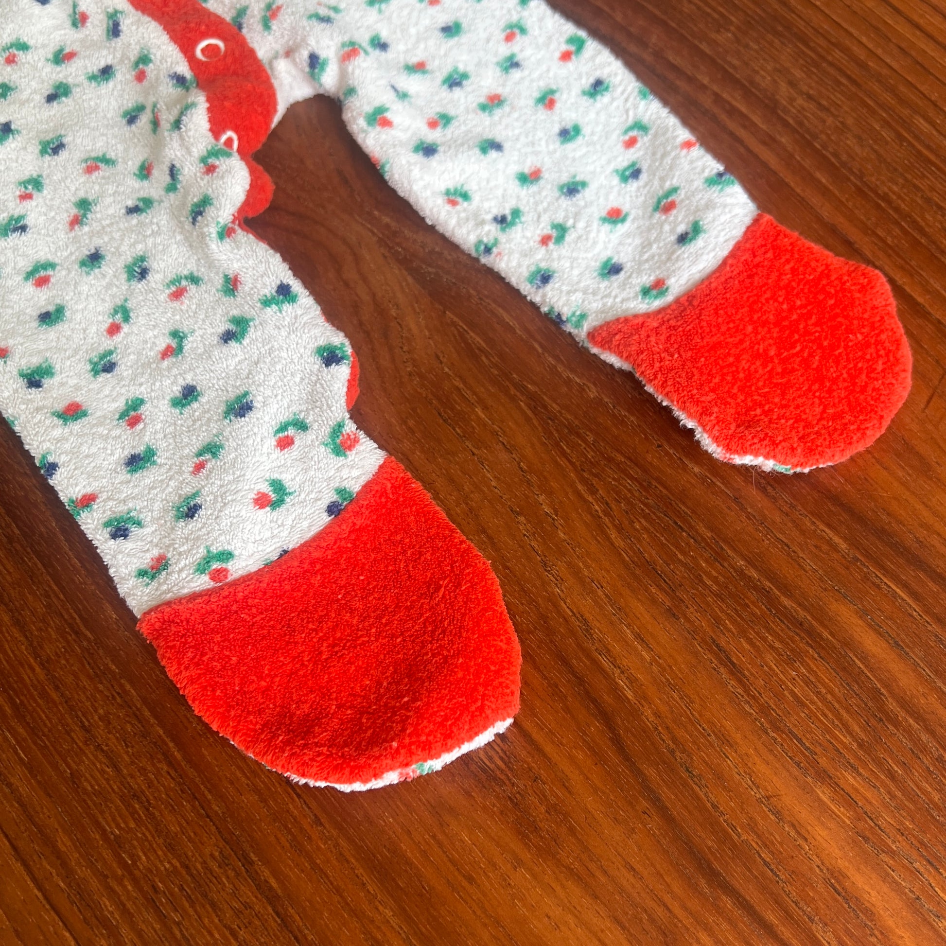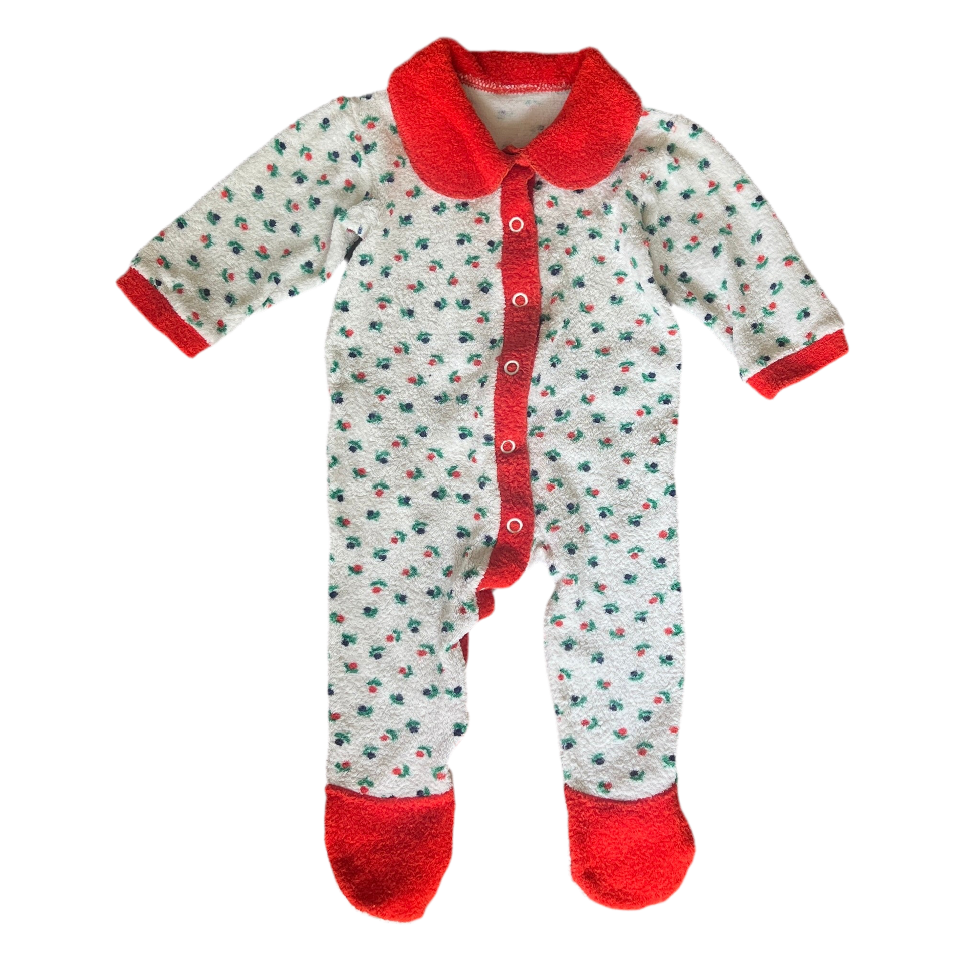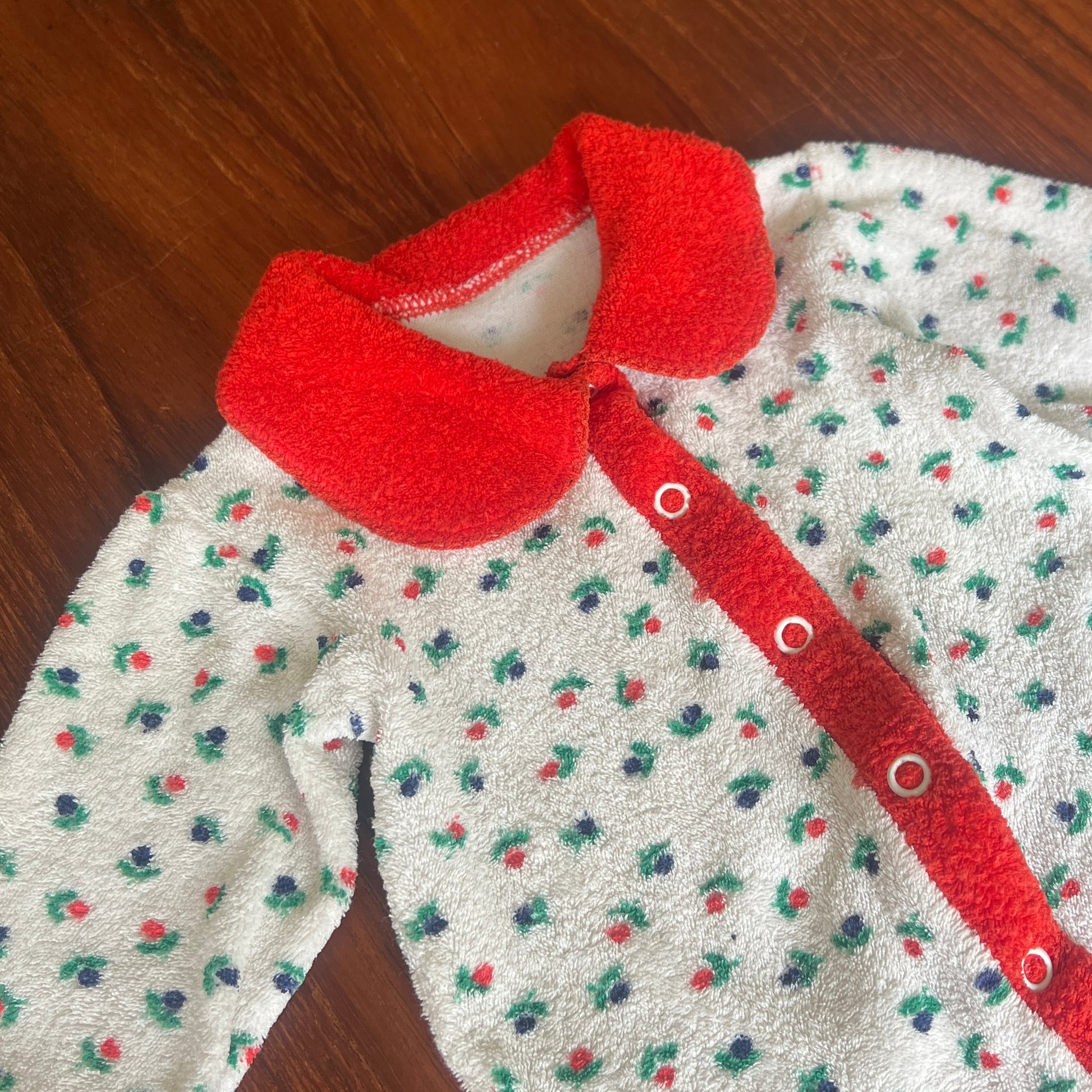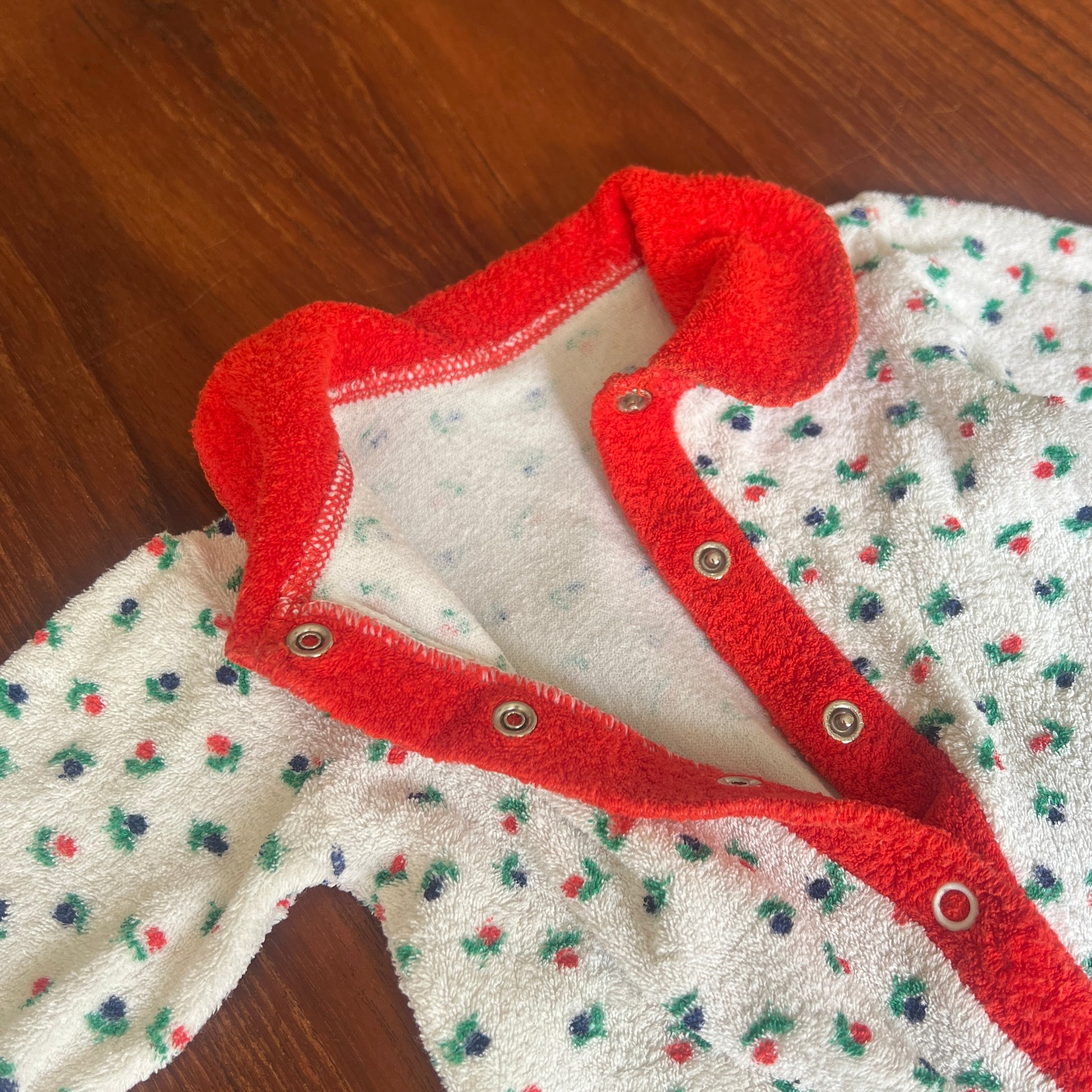 Blød vintage heldragt i en skøn mønstret frotté – perfekt til hyggestunder og varme kram. Dragten har trykknapper hele vejen foran, så den er nem at få af og på. Det fine blomster design giver et ægte retro-look, der skiller sig ud.
