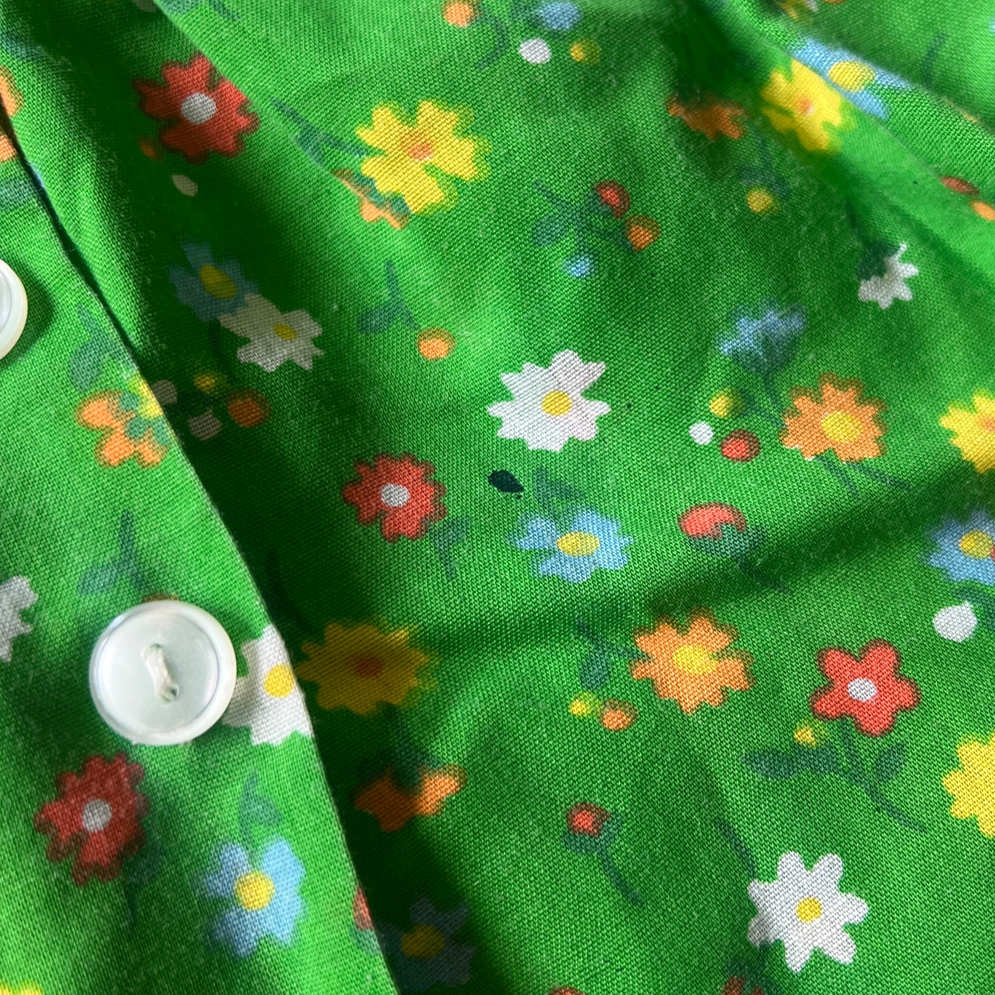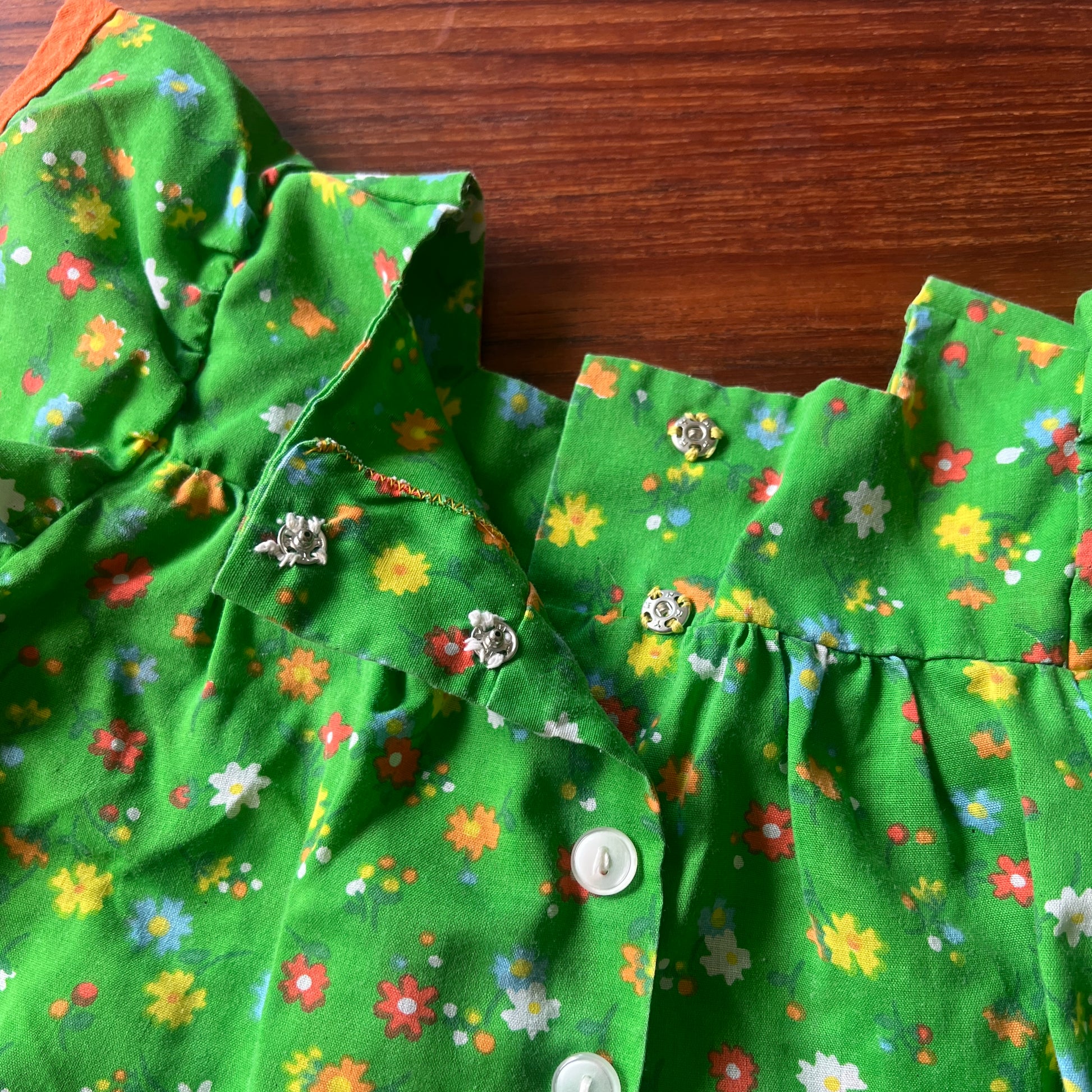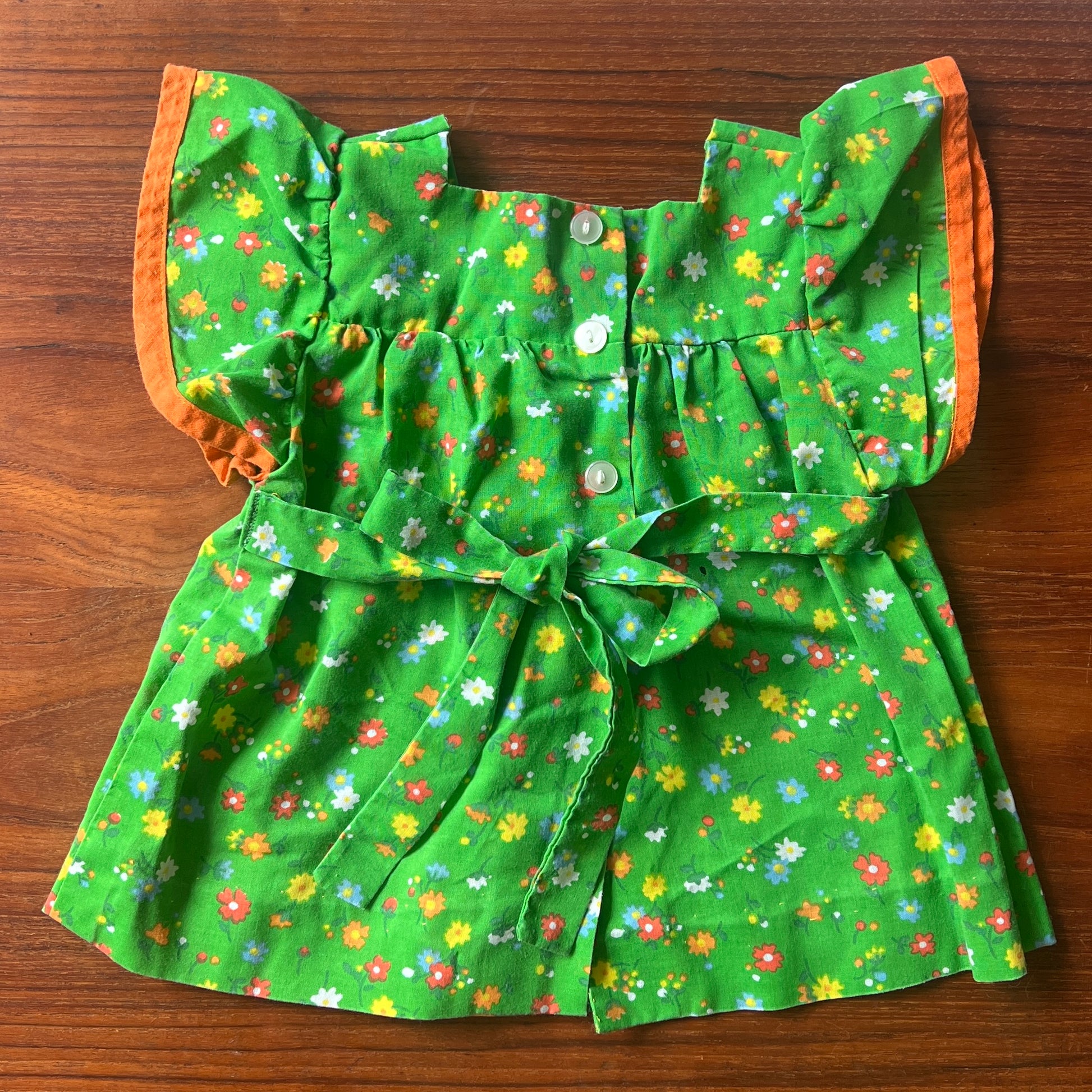 Unik, hjemmesyet kjole i en smuk grøn farve med fine orange kanter og bindebånd i livet. Kjolen har et enkelt og sødt snit – perfekt til både leg og sommerdage. Et helt særligt stykke, der emmer af håndværk og personlighed.