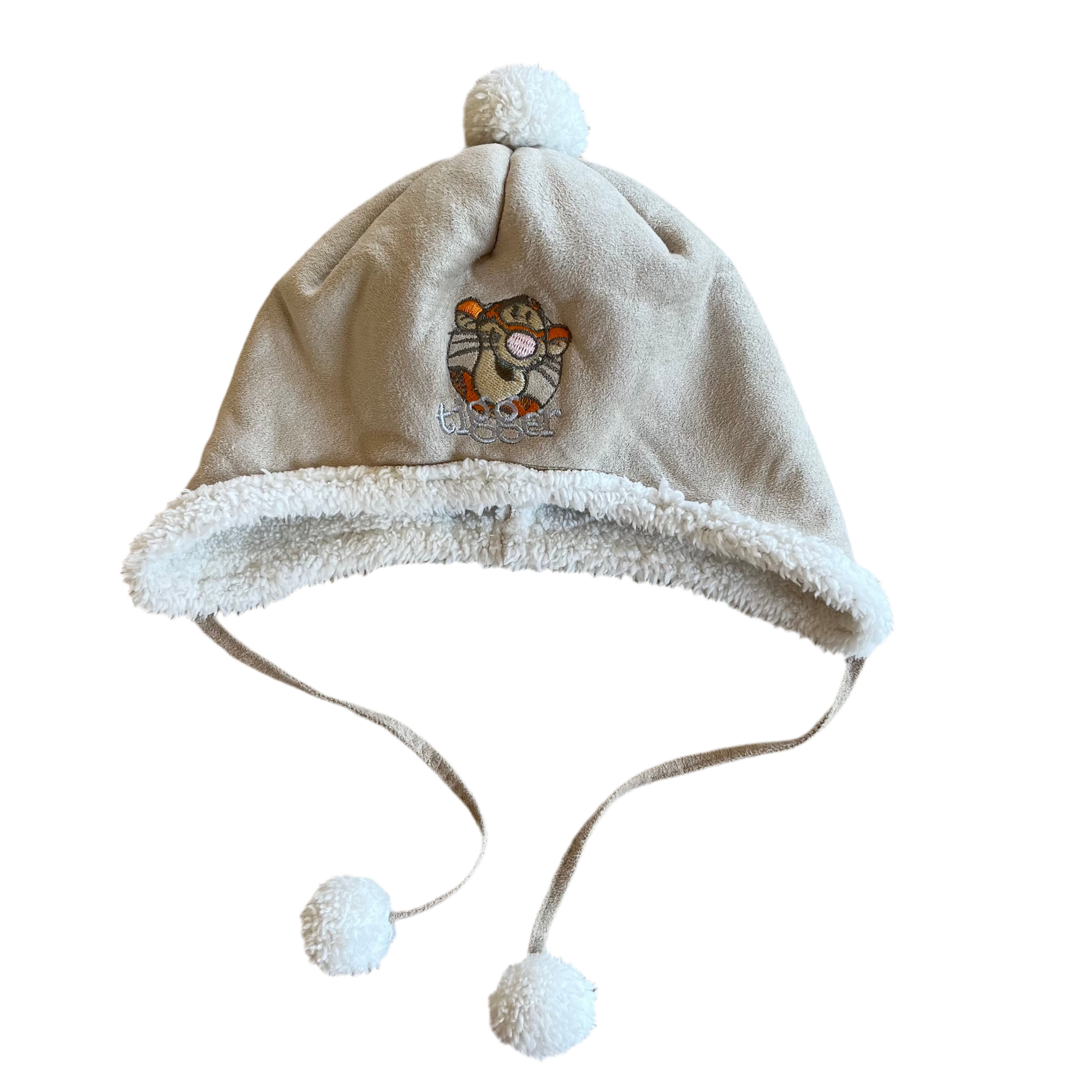 Sød baby vinterhue med Tigerdyret fra Peter Plys. Huen er blød med hvidt fleecefor, der giver ekstra komfort og varme på kolde dage. Den søde pompon på toppen og de to snore med små kvaster gør huen ekstra sød og særlig. Den er i str 50/68, så den passer fra nyfødt til ca. 6 måneder.