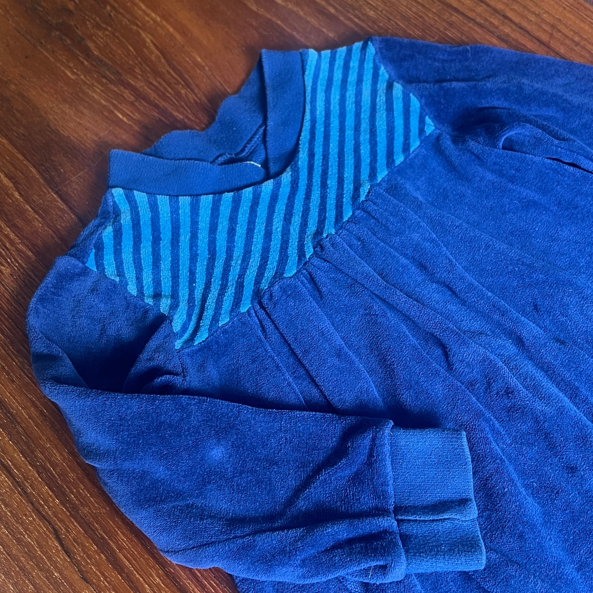 En sand perle fra dengang supermarkedskæden Irma også lavede børnetøj! Denne smukke, blå kjole i blød velour har lange ærmer og et sødt, skråtstribet bryststykke i lys- og mørkeblå. Kjolen har et klassisk snit med let vidde og fine læg foran – perfekt til både hverdag og særlige lejligheder.