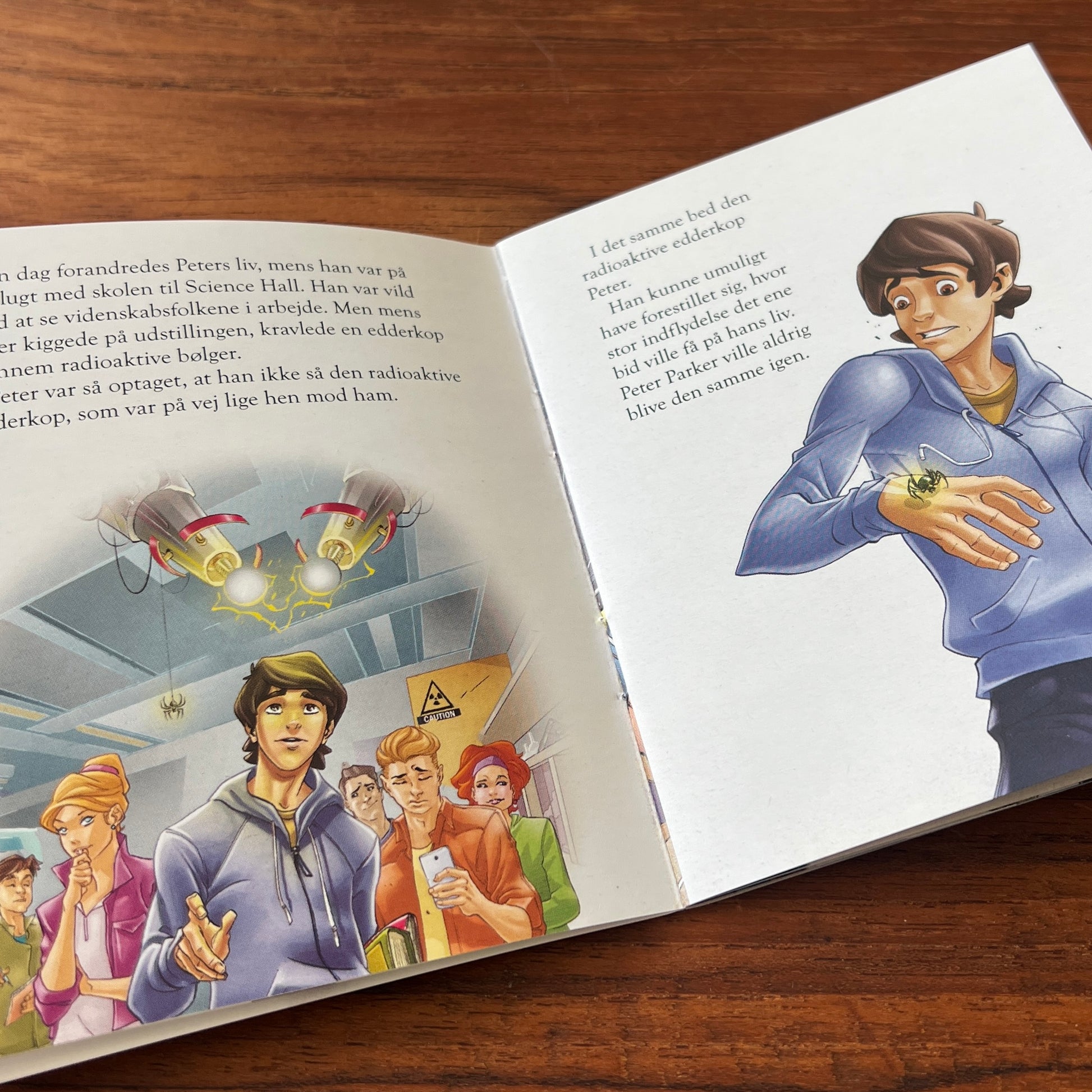 Læs historien om, hvordan Peter Parker bliver til superhelten Spiderman. Med store kræfter følger stort ansvar – og Peter må lære at bruge sine nye evner til at bekæmpe skurke og redde byen. En spændende superheltefortælling i pixibogsformat – perfekt til små hænder og actionfyldt højtlæsning.