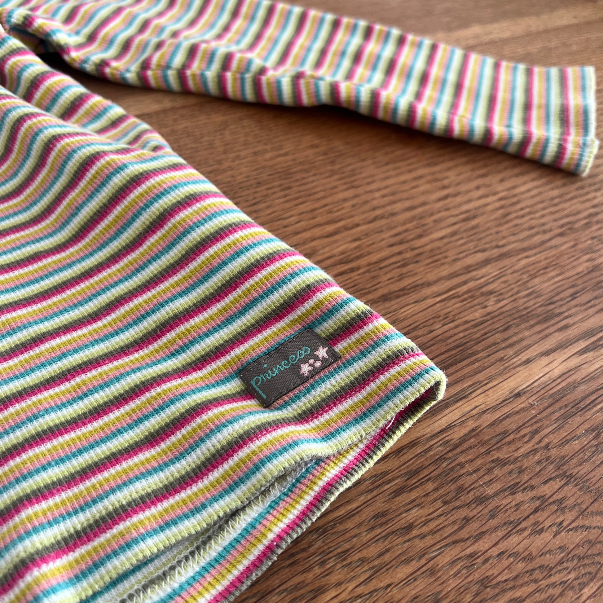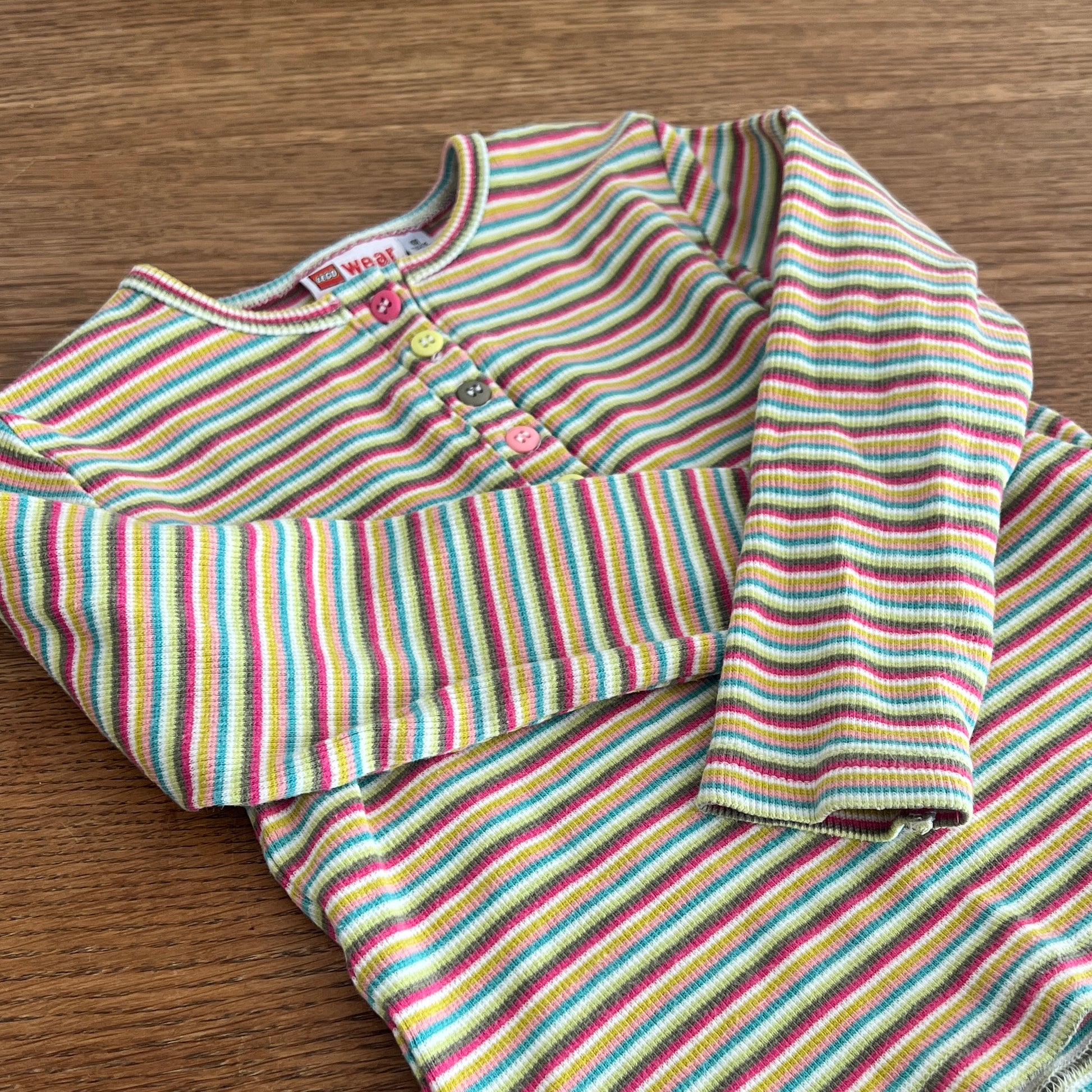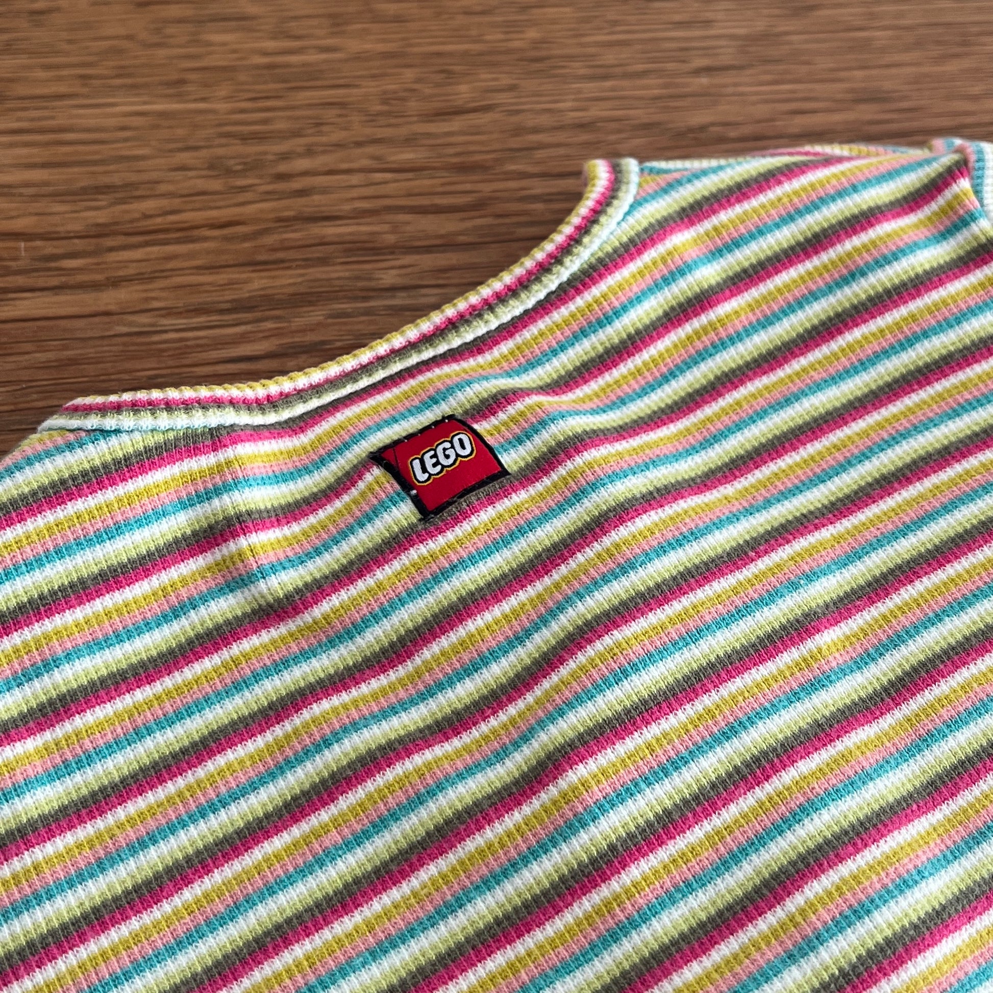 Skøn langærmet bluse fra LEGO i str. 98, med et farverigt og legende design, der skiller sig ud. Blusen har mange forskelligfarvede striber, som giver et tydeligt retro-udtryk, der både er charmerende og tidløst. I halsåbningen foran sidder forskelligfarvede knapper, der ikke kun er praktiske, men også fungerer som en fin detalje, der fuldender det legende look.