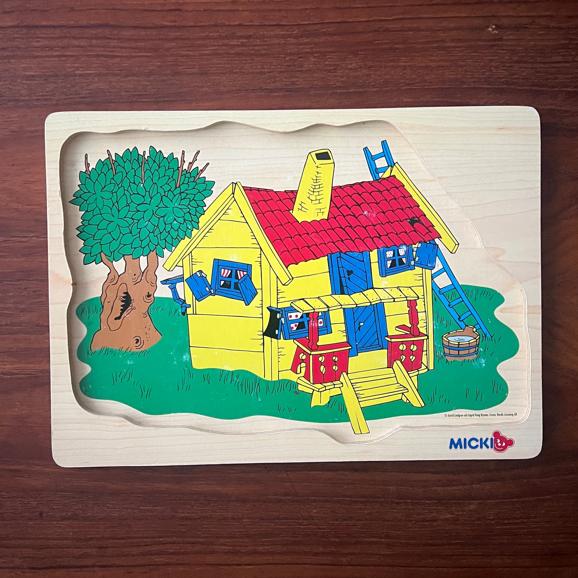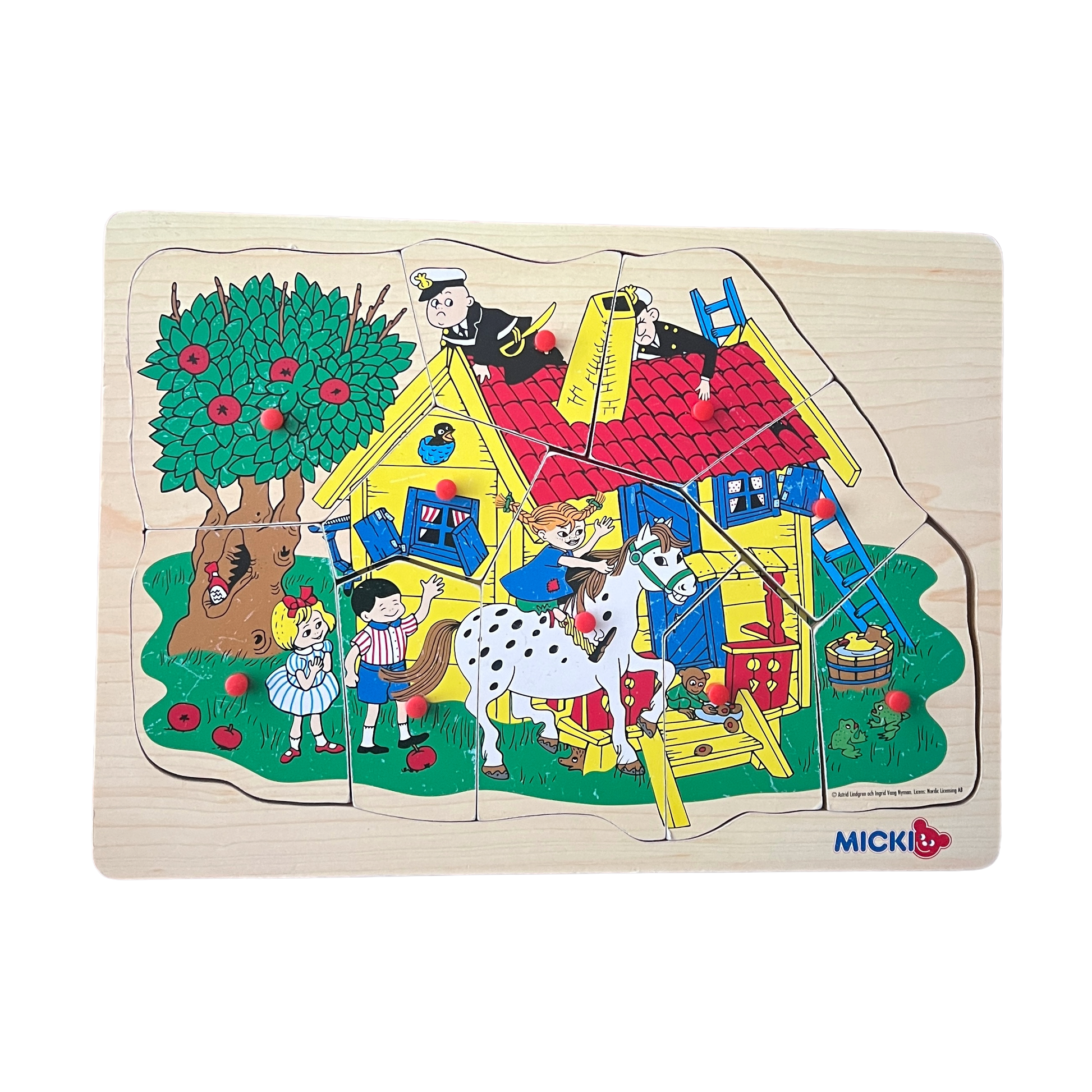 Klassisk svensk Pippi Langstrømpe træpuslespil fra mærket Micki - lavet omkring 1980’erne og kendt for høj kvalitet og tidløst design. Illustrationerne er inspireret af Astrid Lindgrens univers og er kendetegnet ved varme farver og detaljer, der indbyder til fordybelse.